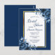 En el frente: fondo azul marino con un marco fino, dorado y blanco. Decorado con flores azules, rosas. Plantillas para el nombre de la novia y detalles del fiesta. El nombre y el texto: Bridal Shower están escritas con un guión de estilo con letras a mano, letras de color azul. Color de fondo azul marino. Sugerencia: Si no desea que se vea como una postal, haga clic en personalizar, vaya a la parte posterior y quite el separador y el sello postal. Esta tarjeta también está disponible en nuestra tienda sin un color de fondo en la parte posterior.