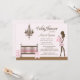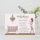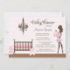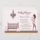 Esta ducha de bebé 5x7 chicas tiene un suave color rosa y blanco chevron zigzag en el fondo. A la izquierda hay una elegante lámpara de araña marrón colgando encima de una cuna. Junto a la cuna hay tres cajas rosas con arcos y un oso de peluche rosa. A la derecha, hay una elegante madre embarazada con el vestido rosado de bebé. En el medio, puede personalizar toda la información de su fiesta. Algunos gráficos en esto son de Olillia en MyGrafico.
