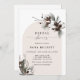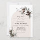 Este elegante y rústico salón de duchas de novias de invierno ofrece un arco beige claro con ramas de flores de pino y algodón de color acuarela y elegantes caligrafías de escritura a mano.