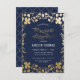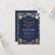 Esta invitación a la ducha de bonito de 3.5"x5" (pequeña) tiene un estilo vintage y cuenta con un borde floral ilustrado y las palabras "Ducha de novia" en oro. El fondo es de color azul marino, pero puede personalizarse según el color que elija. La parte posterior de la invitación incluye un patrón de quatrefoil dorado con un fondo azul que también se puede intercambiar. El texto es el personalizable de su evento especial de celebración pre-boda.