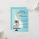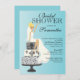 Comience con su elegante ducha nupcial con nuestra moderna invitación a la ducha nupcial con una elegante novia rubia sentada en un elegante pastel de boda de 3 niveles damasquinado sobre un fondo azul. Sólo personalizar nuestra invitación con la información de tu ducha de boda y estás listo para ir. ©Ilustraciones JW