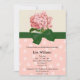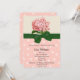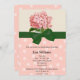 ¡Una bella invitación para que una hermosa novia sea! Cuenta con una hidrangea rosa en la parte superior y un patrón de puntos rosa y blanco en la parte inferior. Un gráfico de una cinta verde y un arco separan los dos. Todo el texto es personalizable.
