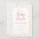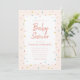 Una llamativa invitación a una ducha de bebé con un arco iris roza el borde sobre un fondo rosa rubor.
