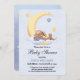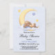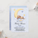 Una invitación a la ducha para bebés decorada con un conejito adorable durmiendo en la luna.