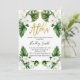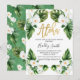 Aloja color agua, follaje tropical y orquídeas blancas invitan a la ducha de bebé. Este diseño presenta varias hojas tropicales verdes y orquídeas blancas en un fondo blanco. El encabezamiento es un falso texto de caligrafía de Relieve metalizado de oro. Es una manera moderna y fresca de invitar a los huéspedes a una ducha de bebé.