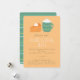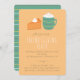 Esta encantadora invitación para una fiesta de Acción de Gracias presenta una atractiva tarta de calabaza con ilustraciones de crema batida y cacao caliente sobre un fondo naranja otoñal.