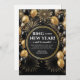 Esta es una invitación de fiesta de Nochevieja elegante y glamurosa con un tema negro y dorado. El fondo es predominantemente negro, adornado con globos dorados y negros agrupados en las esquinas superiores y dispersos por los bordes. En el fondo, fuegos artificiales dorados y detalles brillantes añaden un ambiente festivo. El enfoque central es una gran área circular negra con un contorno dorado delgado, que alberga los detalles del evento en un formato elegante y legible. ¡Totalmente editable, descargable instantáneo e imprimible a través de la plataforma Zazzle!