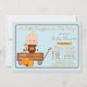 Invitación de baby shower de calabacita con un adorable bebé en un carro de calabazas sobre un fondo azul bebé y marrón. Puedes personalizar fácilmente esta invitación para tu evento simplemente agregando tus detalles.