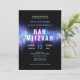 Esta elegante y moderna invitación de Bar Mitzvah presenta un tema de DJ o tema de fiesta de baile con luces de ondas sonoras coloridas sobre un fondo oscuro. Este diseño es animado y llamativo. Esta tarjeta atrae a todas las edades y es perfecta para invitar a los invitados a celebrar con su familia una celebración de Bar Mitzvah divertida, joven y bien organizada. Establecerá el tono para una ceremonia de Bat Mitzvah y una fiesta memorables.