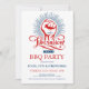 Invitación a la fiesta de barbacoa con fuegos artificiales y estrellas y barras para celebrar el Día de la Independencia de Estados Unidos el 4 de julio. Fondo blanco y tipografía personalizable en rojo y azul.