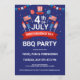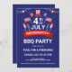 Invitación a la fiesta de barbacoa con fuegos artificiales, banderas de estrellas y barras, globos, celebración del Día de la Independencia.