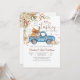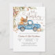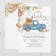 Celebra a tu pequeño con esta encantadora invitación de baby shower de otoño que presenta un camión azul vintage lleno de calabazas, globos y un pavo festivo. Las cálidas hojas de otoño y el diseño rústico crean un ambiente acogedor de temporada, perfecto para reuniones inspiradas en el Día de Acción de Gracias. Con fuentes juguetonas y colores vibrantes, esta invitación marca el tono para una celebración alegre. Ideal para futuros padres que aman los temas de otoño, es una forma encantadora de dar la bienvenida a los invitados a su día especial.