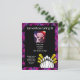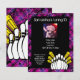 La invitación para la fiesta de cumpleaños de la bolera festiva y divertida incluye pines negros y blancos, estrellas amarillas con fondo rosa neón y negro y diseño de salpicaduras de pintura. Ideal para un fiesta general de chicas, equipo de bolos o cumpleaños para cualquier edad. Añade el nombre del invitado de honor, la foto, los detalles del evento y el título del fiesta al frente, y Personalizar todo el texto para tu fiesta!