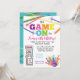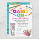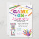Nuestra invitación original para fiesta de cumpleaños Game On Arcade, la más vendida, es la invitación perfecta para cualquier fiesta temática de juegos con temática de arcade, laser tag o bolos. Este diseño presenta letras coloridas con divertidos gráficos de juegos de arcade, bola de bolos y bolos, y haz de láser.