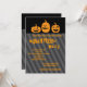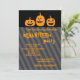 Invitación divertida y moderna a la fiesta de Halloween. Apropiado para cualquier edad. Cuenta con tres calabazas sobre un fondo negro y rayas grises oscuras. Añada su propia redacción.