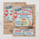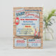 Divertida y fabulosa invitación a la fiesta de Glamping con tienda, linterna, hoguera y malvavisco asado sobre papel vintage antiguo contra un fondo de tablón de madera rústica. Ideal para una noche de chicas, pijamada, fiesta de pijamas, fiesta de cumpleaños o despedida de soltera. Ilustración dibujada a mano por McBooboo.