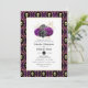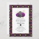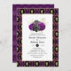 Invitación a mediodía de damasquinadas moradas, negras y doradas con rosas y fondo ornamentado de cráneo damasco con un patrón de entramado invertido.
