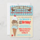 Invitación a la fiesta de cumpleaños inspirada en la heladería de moda antigua, con un ilustracion de helados en diferentes patrones amontonados entre sí, con tipografía divertida, toldos rayados, pancartas y cerezas todo sobre un fondo acuático vintage. Ideal para un cumpleaños o para un helado social. Ilustracion dibujado a mano por McBooboo.