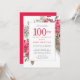 Honre a una mujer especial con esta elegante y femenina invitación a la fiesta de cumpleaños número 100. 100 está escrito en un gran texto rojo. Sigue la celebración del cumpleaños. El nombre del invitado de honor también está escrito en letras rojas mayúsculas. Los detalles de la celebración de cumpleaños están rodeados de un marco de moda decorado con flores rojas de poinsettia, flores y bayas y pinares. Aunque es un diseño tradicional, el follaje y el texto botánicos abiertos y ventilados le dan un aire contemporáneo. La invitación de vuelta es un rojo profundo.