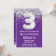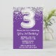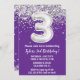 Púrpura y plata 3ª invitación de fiesta de cumpleaños 3 cumpleaños invitación de fiesta con escritura de escritura purpurina y escritura moderna y globos de Relieve metalizado divertidos.