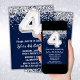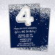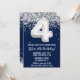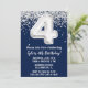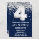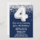 Invitación a la fiesta de cumpleaños número 4, azul marino y plata. Invitación a la fiesta de cumpleaños 4 con escritura de escritura purpurina y moderna y globos de Relieve metalizado divertidos.