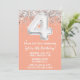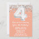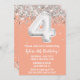 Peach and Silver 4 cumpleaños invitación a la fiesta de 4 años, 4 cumpleaños, invitación a la fiesta con escritura de escritura purpurina y moderna y globos de Relieve metalizado divertidos.