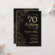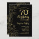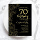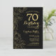 Invitación a la fiesta de cumpleaños 70 de Black Gold Floral. Diseño moderno minimalista con dibujos botánicos de contorno acentos, Relieve metalizado de oro falso y tipo de letra de escritura tipográfica. Sencilla carta de invitación a la moda, perfecta para una elegante celebración de cumpleaños femenina. Se puede personalizar a cualquier edad. Invitaciones Zazzle impresas o una plantilla imprimible digital de descarga instantánea.
