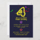 Invitaciones de 4 cumpleaños de colores vivos que incluyen un neón "4", estrellas y confeti.