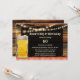 Invitación a la fiesta de cumpleaños de los amantes de la cerveza con una imagen de gingham en barbacoa y una cerveza en madera rústica con luces de cuerda.