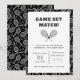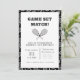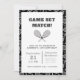 Sirva para una celebración ganadora con esta invitación de cumpleaños al tenis con audaces raquetas blancas y negras, pelotas de tenis y tipografía juguetona. Perfecto para un fiesta de tenis infantil, un cumpleaños con temática deportiva o un evento de club de tenis, este diseño marca la pauta para un día divertido y activo. Personalice los detalles de su fiesta e impresione a sus huéspedes con esta moderna invitación para jugar a juegos para niños amantes del tenis.