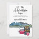 Que la aventura comience la invitación de cumpleaños de acuarela con acuarela temática con el paisaje silvestre de bosques y montañas y tipografía de escritura caligrafía. ¡Por un fin de semana de diversión!