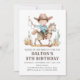 Personaliza tu propia invitación de cumpleaños con temática de vaquero con este encantador diseño. La invitación incluye un detallado ilustracion de un joven vaquero montando un caballo, con un fondo blanco.