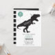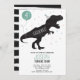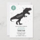 Todo el texto se puede editar en la invitación. Perfecto para un tema moderno de Dinosaurios. Posee follaje verde, dinosaurios, t-rex, globo y confeti.