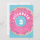 Invitación a la fiesta de cumpleaños de un niño caprichoso creada al estilo de una estampilla vintage. El texto juguetón se coloca encima de un gran ilustracion de donut y está rodeado por una serie de rociadas de colores y arcoiris. La parte posterior de la tarjeta presenta un patrón de rociado coordinado. Aunque se creó para un fiesta de donut, también sería perfecto para un fiesta de piscina durante el verano.