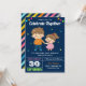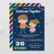 Sorprende a tus invitados con esta invitación de cumpleaños gemela que incluye a un chico lindo y a un chica con tipografía moderna con un fondo azul. Simplemente agregue los detalles de su evento en esta plantilla fácil de usar para convertirla en una invitación única. Girar la tarjeta para mostrar un patrón de franjas coloridas en la parte posterior de la tarjeta.