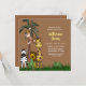 Invitación a la fiesta de cumpleaños temática de la jungla con toda la banda de Safari. Personalizar las invitaciones de tu grupo con tus detalles. El diseño tiene cebra, león, jirafa, mono y plátano.