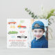 Invitación a la fiesta de cumpleaños temática del transporte con un coche de policía, un coche, un coche de carrera y un camión.