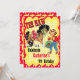 Una encantadora vintage invitación a la fiesta de la vaquera con un fondo de control amarillo y un borde rojo con estrellas delante y el control amarillo y el borde rojo detrás. Personalice la parte delantera de esta invitación con el nombre y el año de cumpleaños y todo el campo de texto de la parte posterior para que se adapte a su evento. Puedes borrar y alinear que no necesites. También se pueden cambiar los estilos de fuente y los colores de fuente. Utilice esta plantilla de invitación para fiestas de cumpleaños u otros eventos temáticos occidentales.
