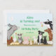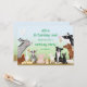 ¡Abajo en la granja todos los animales están muy emocionados por tu cumpleaños! Esta encantadora invitación personalizada a la fiesta de cumpleaños de un niño incluye un burro, una oca, una gallina y sus pollitos, una cabra, un lechón, un conejo, dos corderos, un collie fronterizo, un gato negro y una vaca y su ternera.