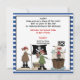 Invitación a la fiesta de cumpleaños de los niños piratas que incluye un barco pirata con bandera pirata Skull y Cross Bones, un cofre pirata del tesoro y algunos niños piratas lindos, uno con un gancho y un loro en el brazo, otro con un mapa del tesoro y una espada y todos con parches en los ojos. Alrededor hay un borde de rayas azules y blancas. Un diseño adorable perfecto para cualquier niño que escoja un tema pirata para su fiesta. Negro, marrón, rojo, blanco, verde, azul, beige.