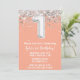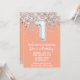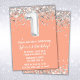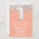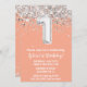 Peach and Silver La invitación de la fiesta de primer cumpleaños a la edad de 1 cumpleaños con la invitación de la fiesta de purpurina y escritura de escritura moderna y globos de Relieve metalizado divertidos.