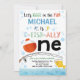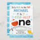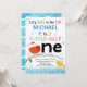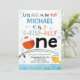 Una invitación de cumpleaños o-fish-almente, perfecta para una celebración con tema de pesca. Cuenta con tipografía en negrita, burbujas, peces dorados, flotador rojo, anzuelos y elementos de agua.