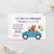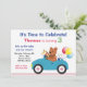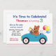 Invite a la familia y amigos a la fiesta de cumpleaños de su hijo con estas adorables invitaciones a la fiesta de autos de carrera. Cuenta con un oso de peluche y otros juguetes en un lindo auto azul con globos de cumpleaños coloridos. Personalizar con los detalles de su fiesta! Algunos elementos © Lilly Bimble
