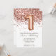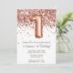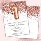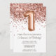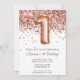 Invitación a la fiesta de cumpleaños 1 Rosa Gold y elegante y rosa de oro, invitación a la fiesta de primer cumpleaños para un chica de un año con escritura moderna y divertidos globos de Relieve metalizado.