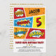 Celebra tu superhéroe con estas impresionantes invitaciones para fiestas de cumpleaños que incluyen todos los detalles de tu fiesta en un fondo de tiras cómicas. Perfecto para los niños que aman los superhéroes y las historietas.