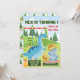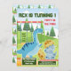 Esta tarjeta presenta una ondulación de bebé dinosaurios y su mamá en el parque con árboles verdes, columpios, una caja de arena y un hermoso cielo azul. Invitación a la fiesta de primer cumpleaños de un niño pequeño lindo y dulce con dinosaurios T-Rex azules. Puedes cambiar los estilos de texto/fuente/colores/edad del niño (si estás celebrando su segundo, tercer, cuarto...).