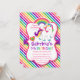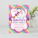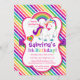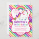 Arcos de lluvia, unicornios y mucho más! Esta invitación a la fiesta de cumpleaños incluye un arcoiris, un unicornio colorido y un corazón encima de un fondo a rayas arcoiris.