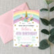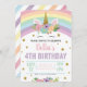 Se trata de una fiesta de cumpleaños temática de unicornio y arcoíris invitada para los niños. El diseño incluye arcoiris y decoración purpurina con estrellas, arcos y flores.
