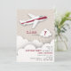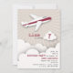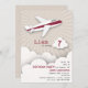 Invitación a una fiesta de cumpleaños con el ilustracion de un avión blanco con rayas rojas volando sobre las nubes. Personalice el texto.