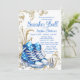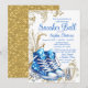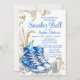 Invitación al baile de zapatillas con zapatillas azules bonitas y diamantes en un hermoso fondo de remolino dorado. Esta invitación de baile de zapatillas se personaliza fácilmente para su evento simplemente agregando sus datos.